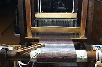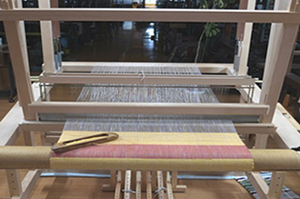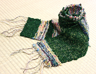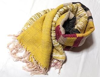 ストールやこれまでの小幅ではつくれなかったモノを新しい色づかいや糸で織り上げます。一点一点表情が違うのも魅力のひとつ。