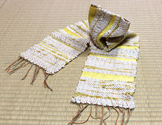 | 真綿そのものをいかしたオリジナルの糸「Pocco」と風合いのある絹糸を使用しました。 軽くて暖かく、普段使いにおすすめです。雰囲気のある白とレモン色がやさしい色づかいです。 |