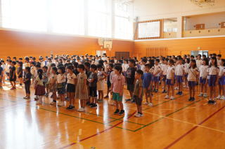 各学年、一人ひとりの大きな成長を感じながら77日間の1学期が無事終了しました。一学期の頑張りを代表児童2年佐竹愛羅さんと4年舩山絢萌さんが堂々と発表し、暑い中の体育館でしたが、よい終業式を行うことができました。