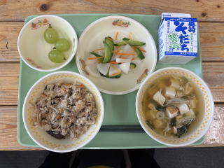 今日のメニュー 鶏ひじきご飯 浅漬け 生揚げの味噌汁