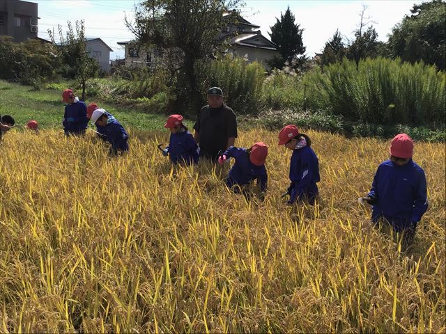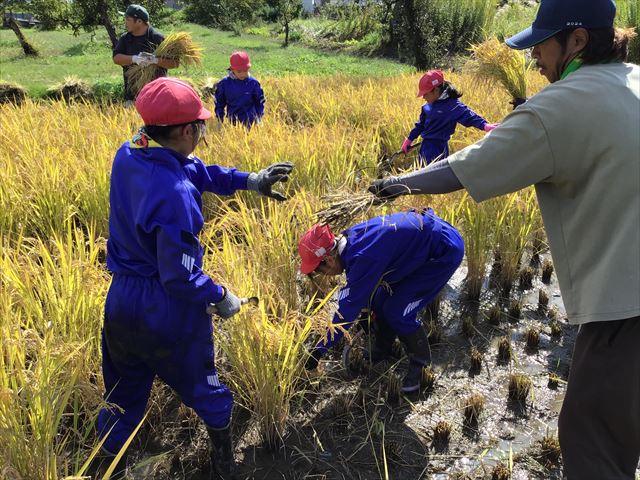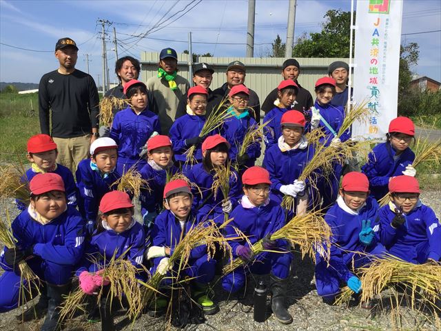 5年生が、JA青年部の皆様のご指導のもと、稲刈り体験を行いました。春に植えた稲が黄金に実り、手で丁寧に刈り取りました。JA青年部の皆様、大変ありがとうございました。