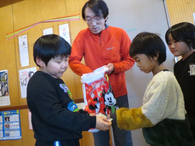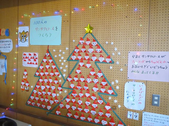 ひまわり学級の前に飾られたクリスマスツリーの点灯式を行いました。カウントダウンとともに、LEDの照明に彩られた大きなツリーが一層華やかに見えました。折り紙で作った100人目のサンタさんのお披露目もありました。子ども達に幸せが訪れますように、と心から願います。