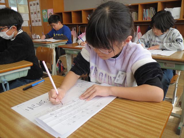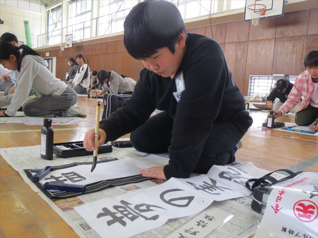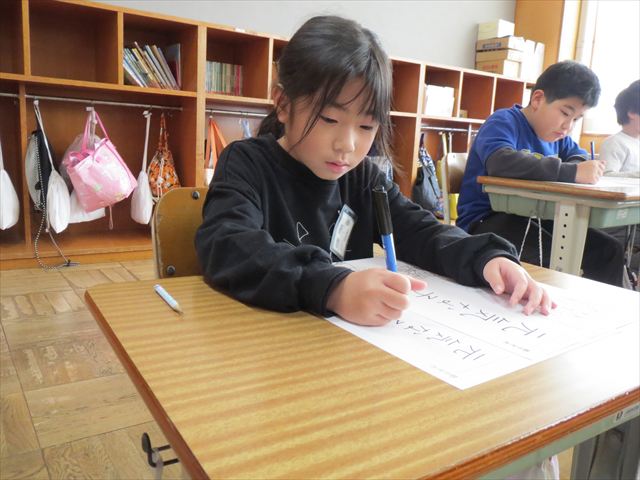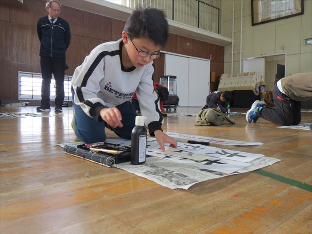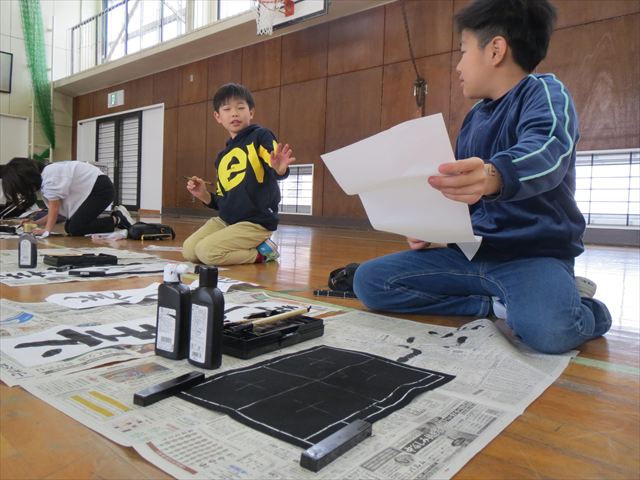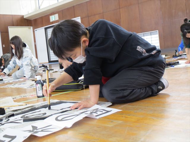 今年1年間、学習を頑張る「講書始め」の意味をこめて、全校で書初めを行いました。1・2年生は教室で、3年生から6年生は体育館で、少し緊張した雰囲気の中で、それぞれ自分の作品に集中していました。